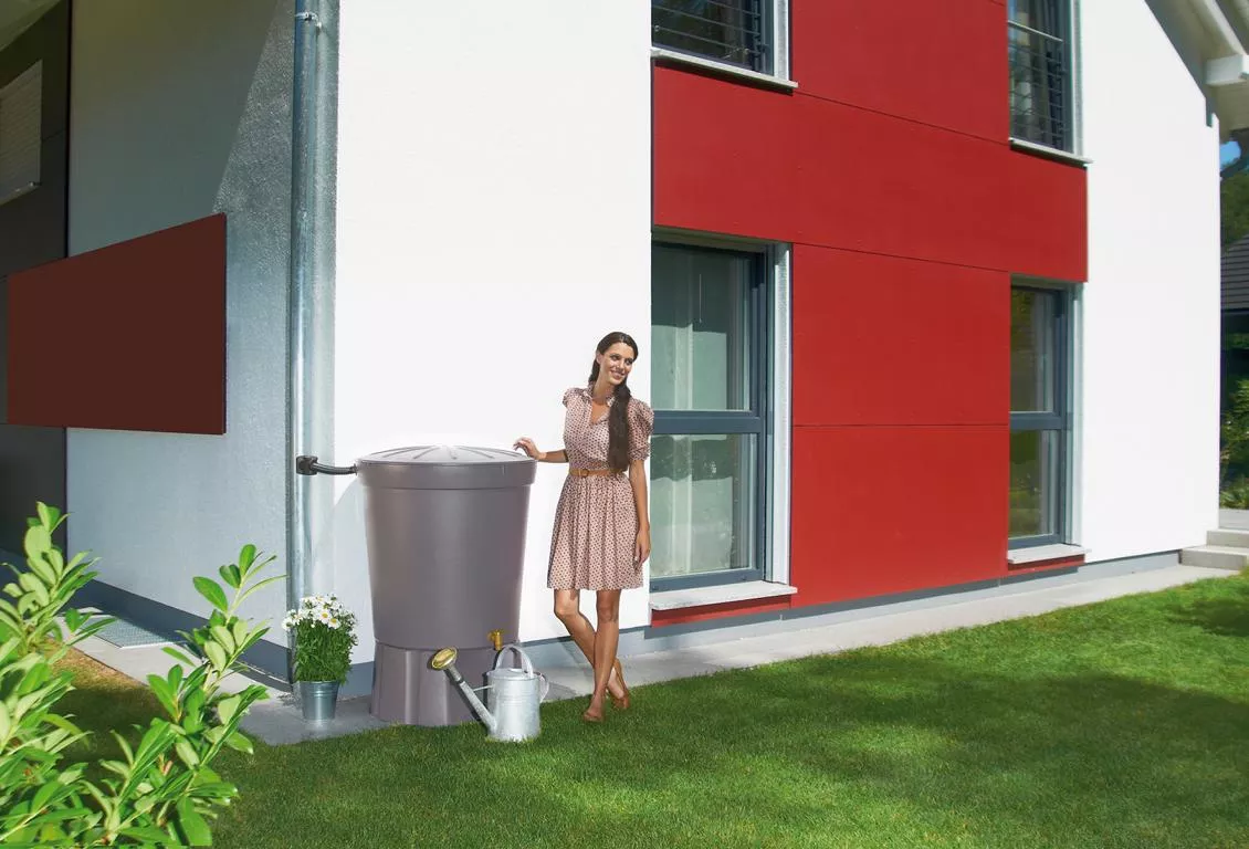 Hergestellt aus 100% Recyclingmaterial (PP) Kunststoff-Regentonne in trendiger Farbgebung Optional mit passendem Unterstand für die komfortable Entnahme des Regenwassers über den Auslaufhahn in die Gießkanne Inkl. Kindersicherung und Aqua-Quick Kunststoffhahn in Messingoptik, Größe 1,9 cm (3/4'')