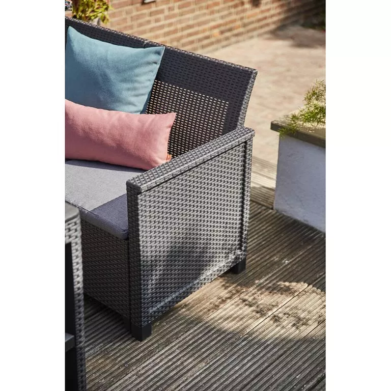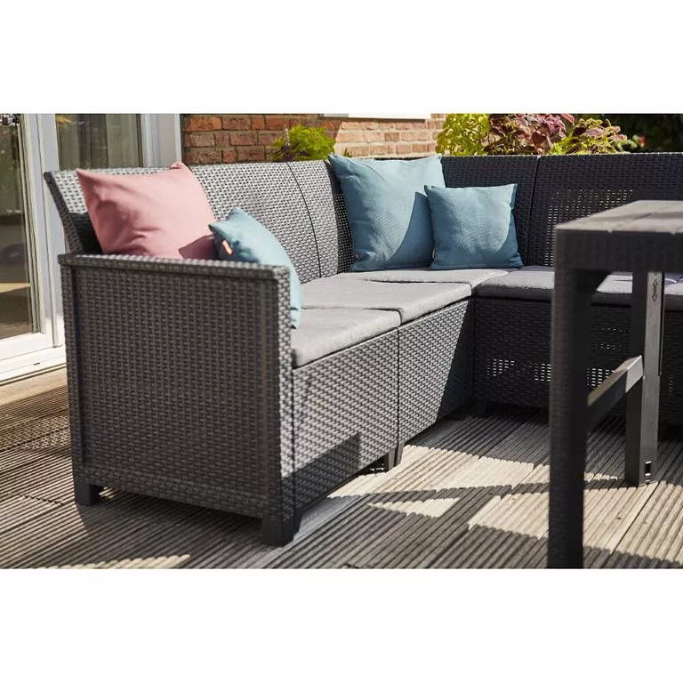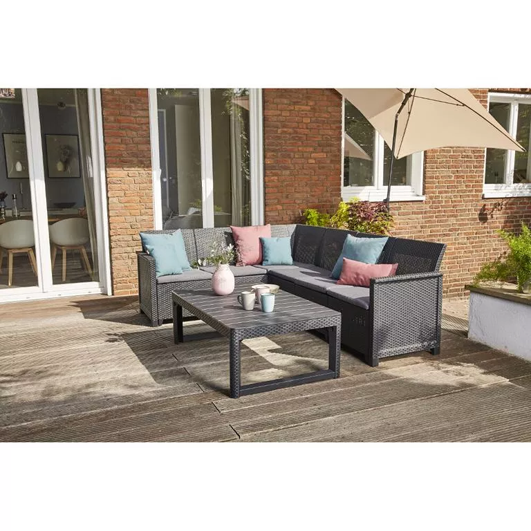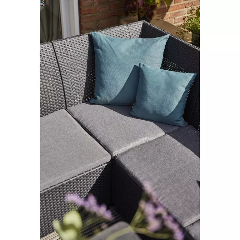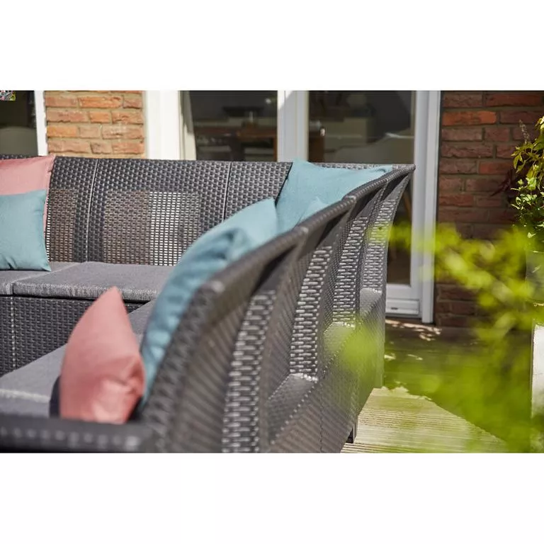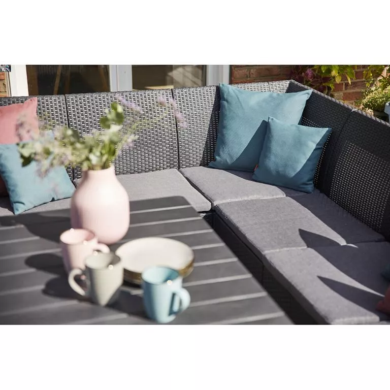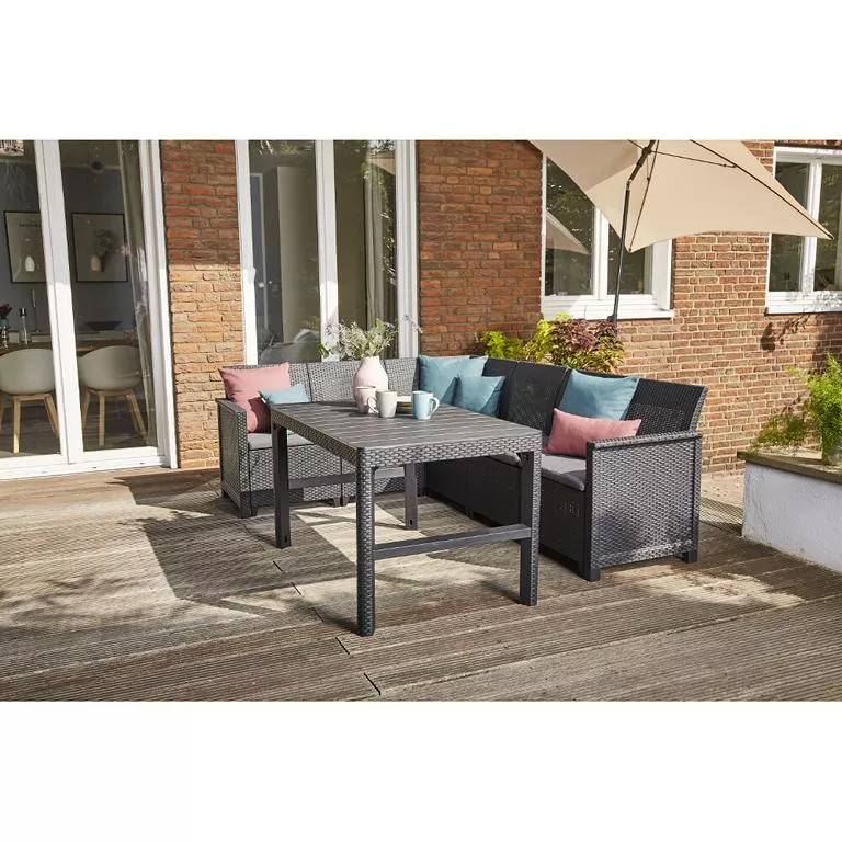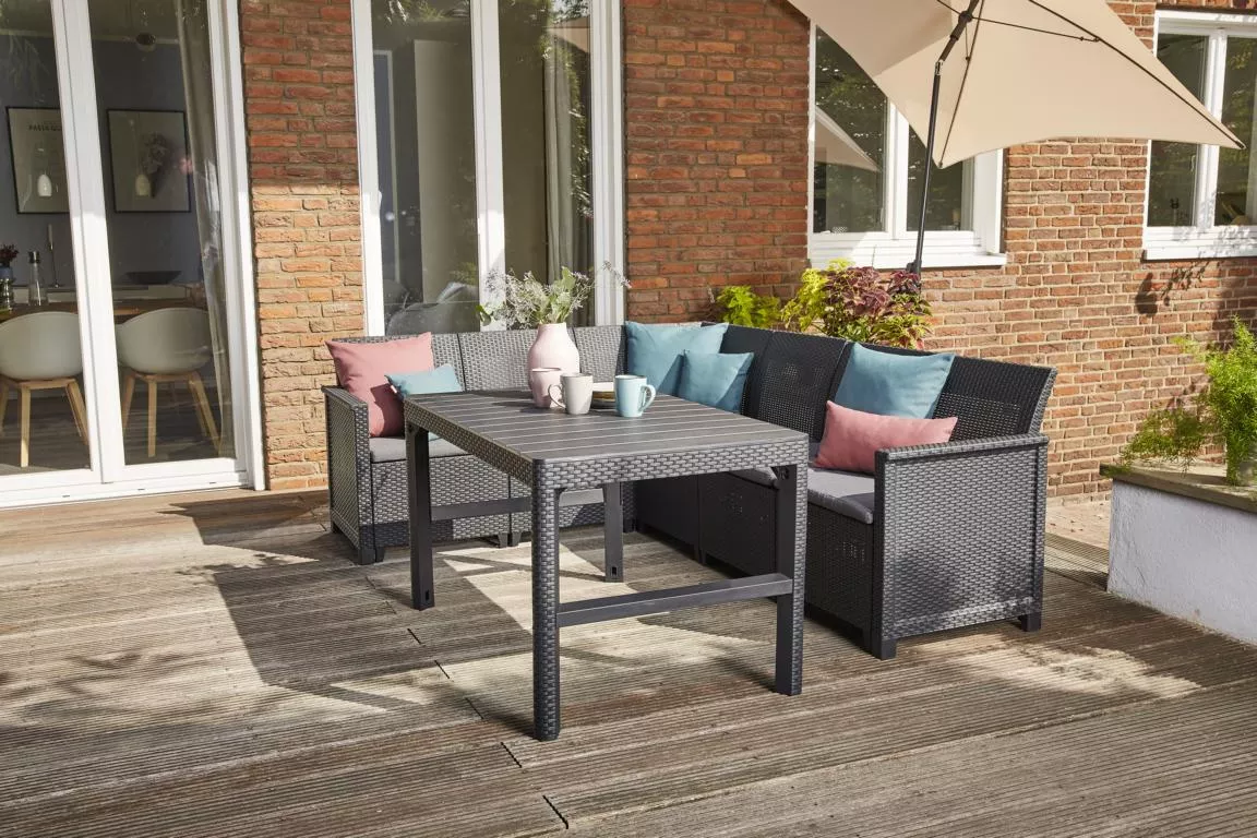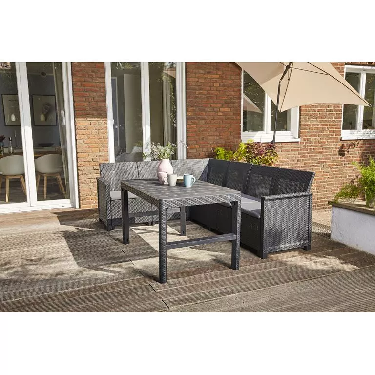Kunststoff, Farbe: graphit, Geflecht-Optik, bestehend aus: Ecksofa, Maße: ca. L 222/172 x B 65 x H 74 cm, Tisch, Maße: ca. L 117 x B 72 x H 40/67 cm, inkl. Sitzkissen, Farbe: grau