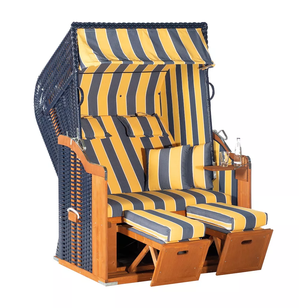Strandkorb aufgebaut, 2 Sitzer, Halbliegemodell, Kunststoffgeflecht blau inkl. Höhenverstellung d. Fußstützen, Fichtenholz, Strukturpolyester, 2 Nackenkissen, 2 kleine Kissen, 2 Fußstützenkissen, 2 kleine Seitentische, aufgebaut