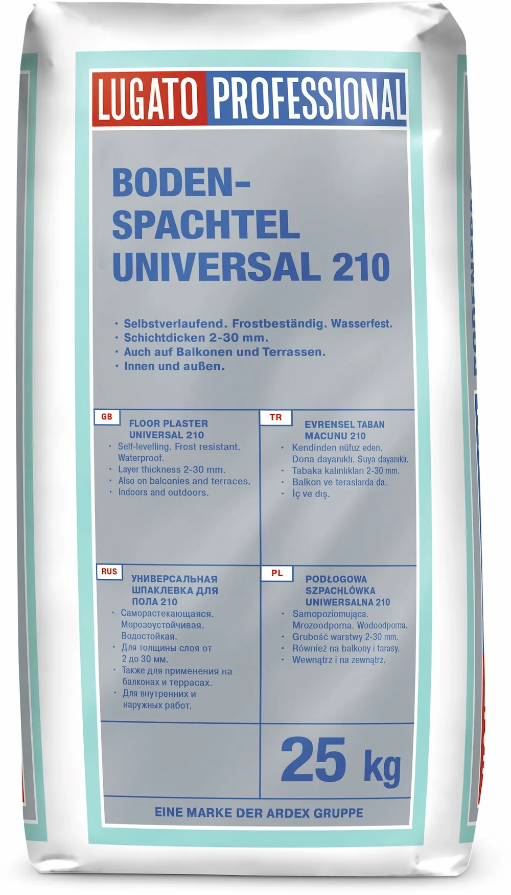 Zementgebundene Bodenausgleichs- und Spachtelmasse. Selbstglättende Oberfläche. Schnell erhärtend, begehbar nach 3 Stunden. Schichtdicken von 3 30 mm, mit Sandstreckung bis 50 mm. Auch auf überdachten Balkonen und Terrassen. Geeignet für dünnschichtige Bodenerwärmungssysteme, Terrazzo sowie alten Fliesenbelägen (innen). Stuhlrollen geeignet. Pumpfähig.
