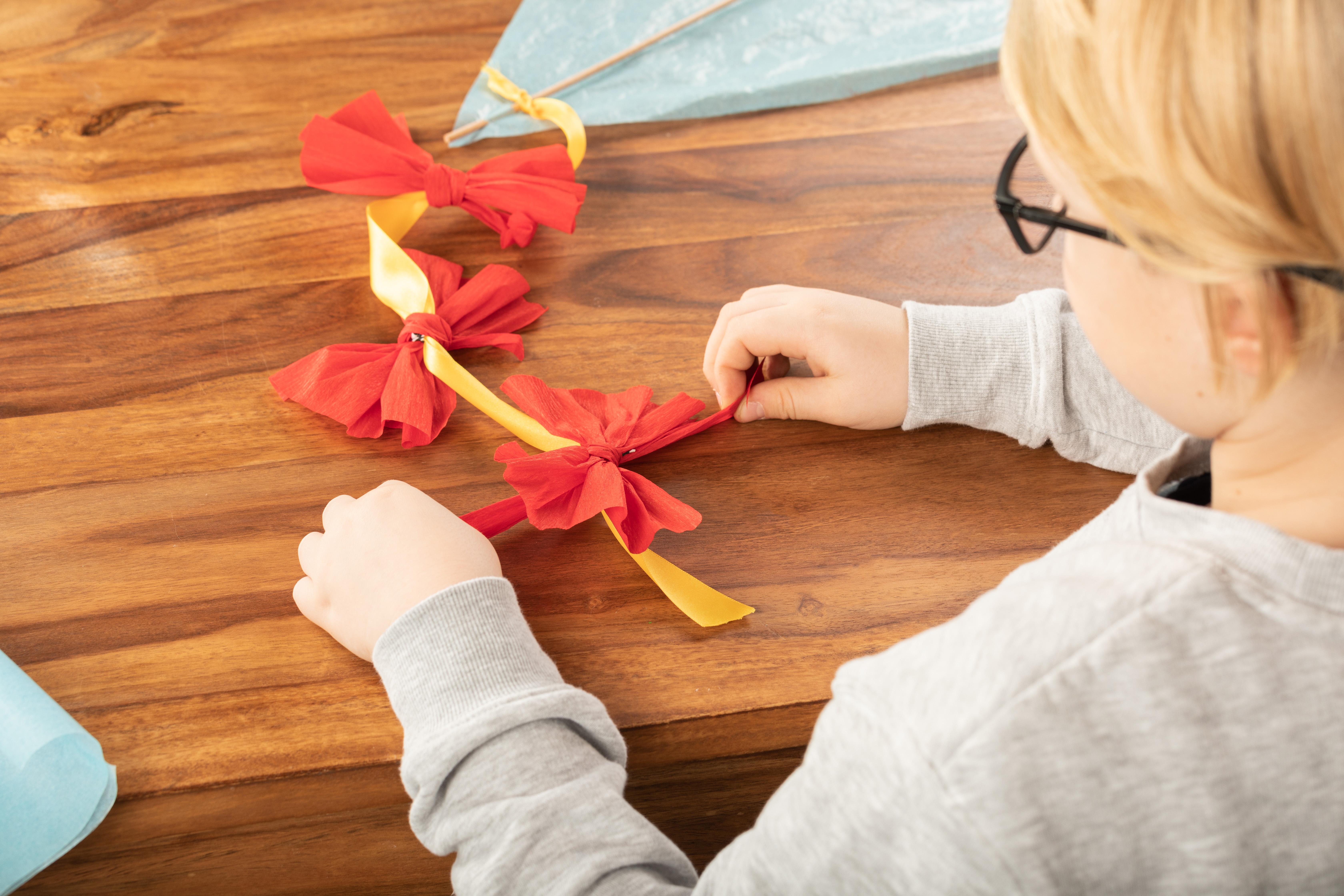 - Ankleben: Klebe das obere Ende deines fertigen Schwanzes mit viel Klebeband an das untere Ende des langen Stabs (auf der Rückseite des Drachens). Der Schwanz hilft deinem Drachen, schön ruhig in der Luft zu fliegen.