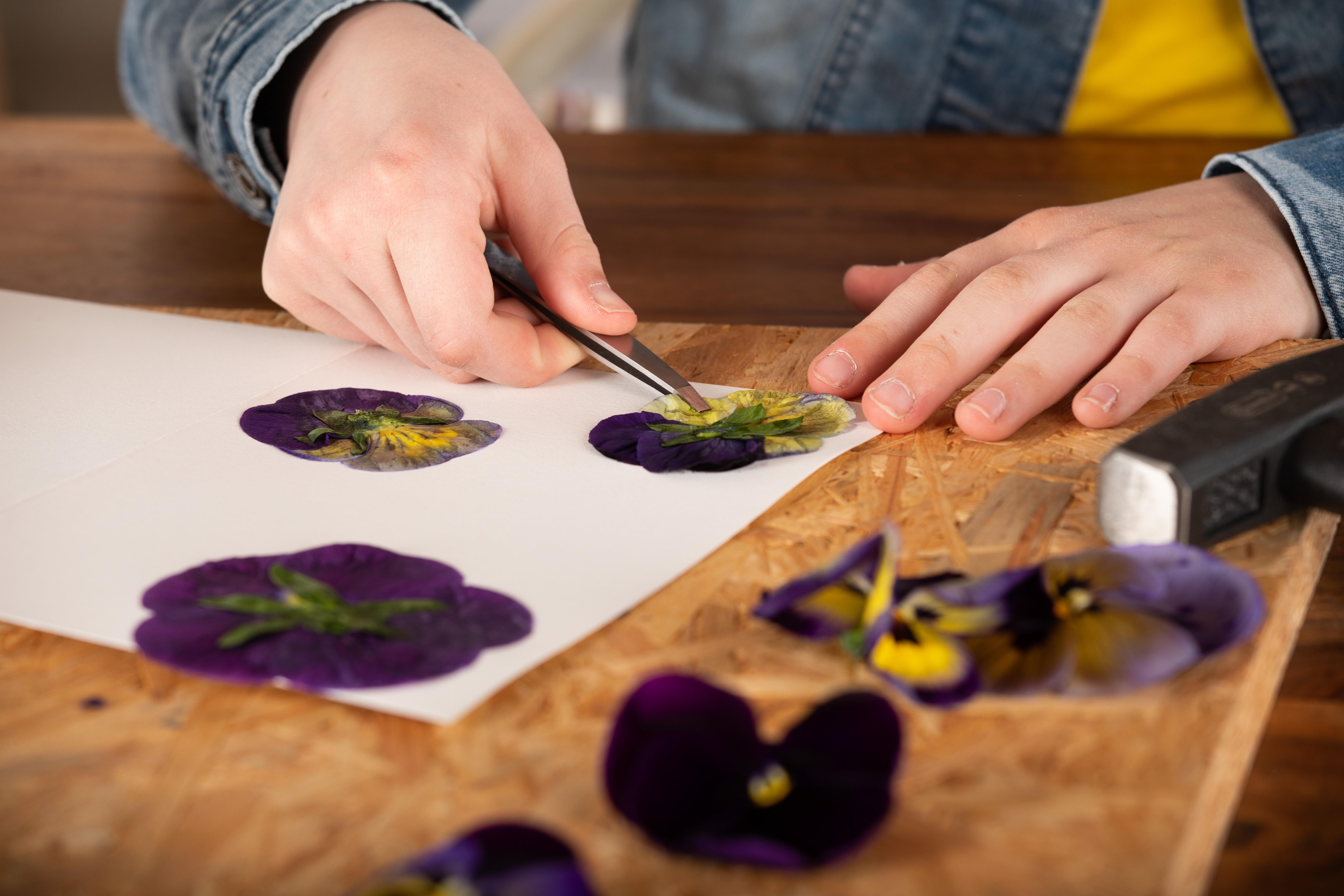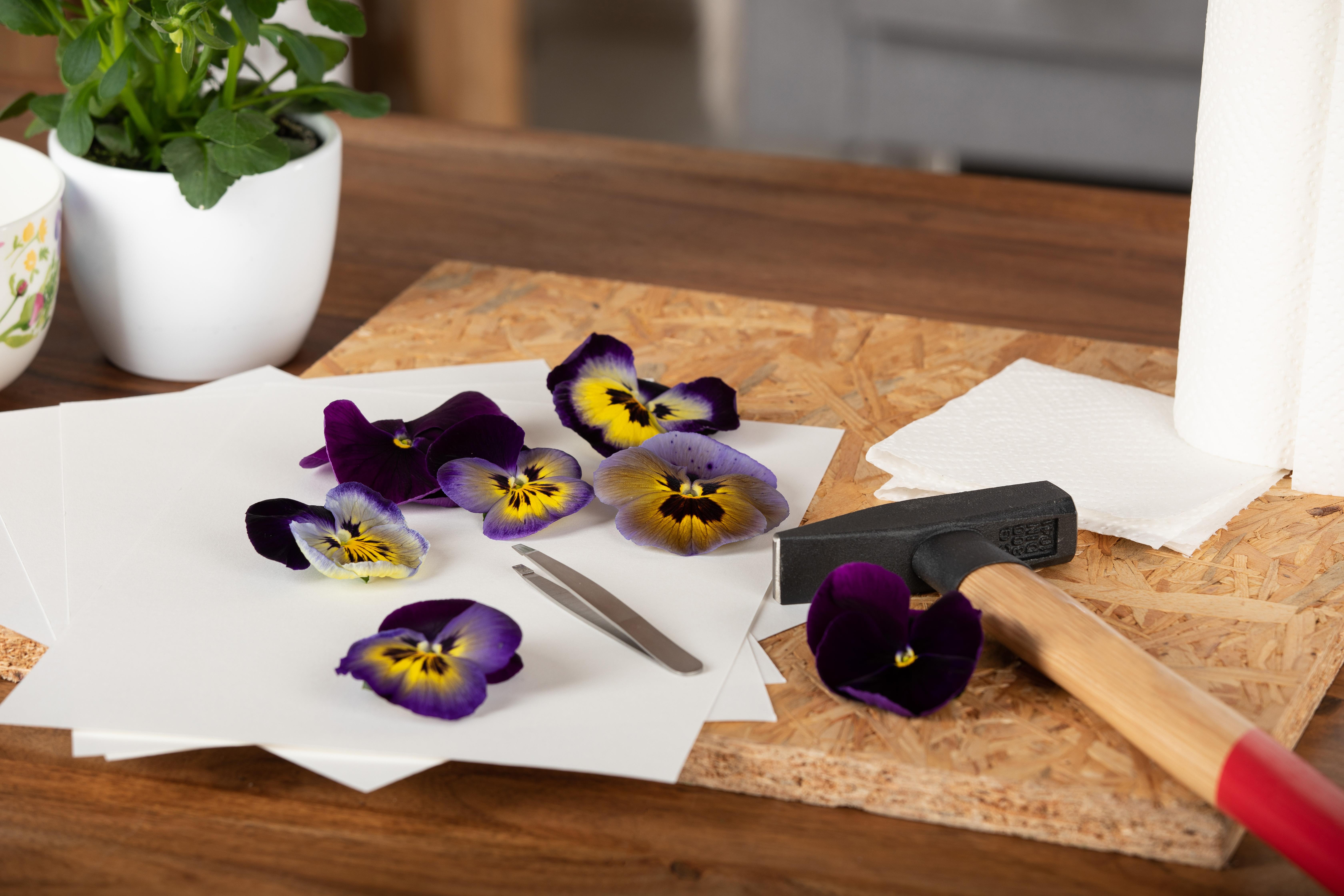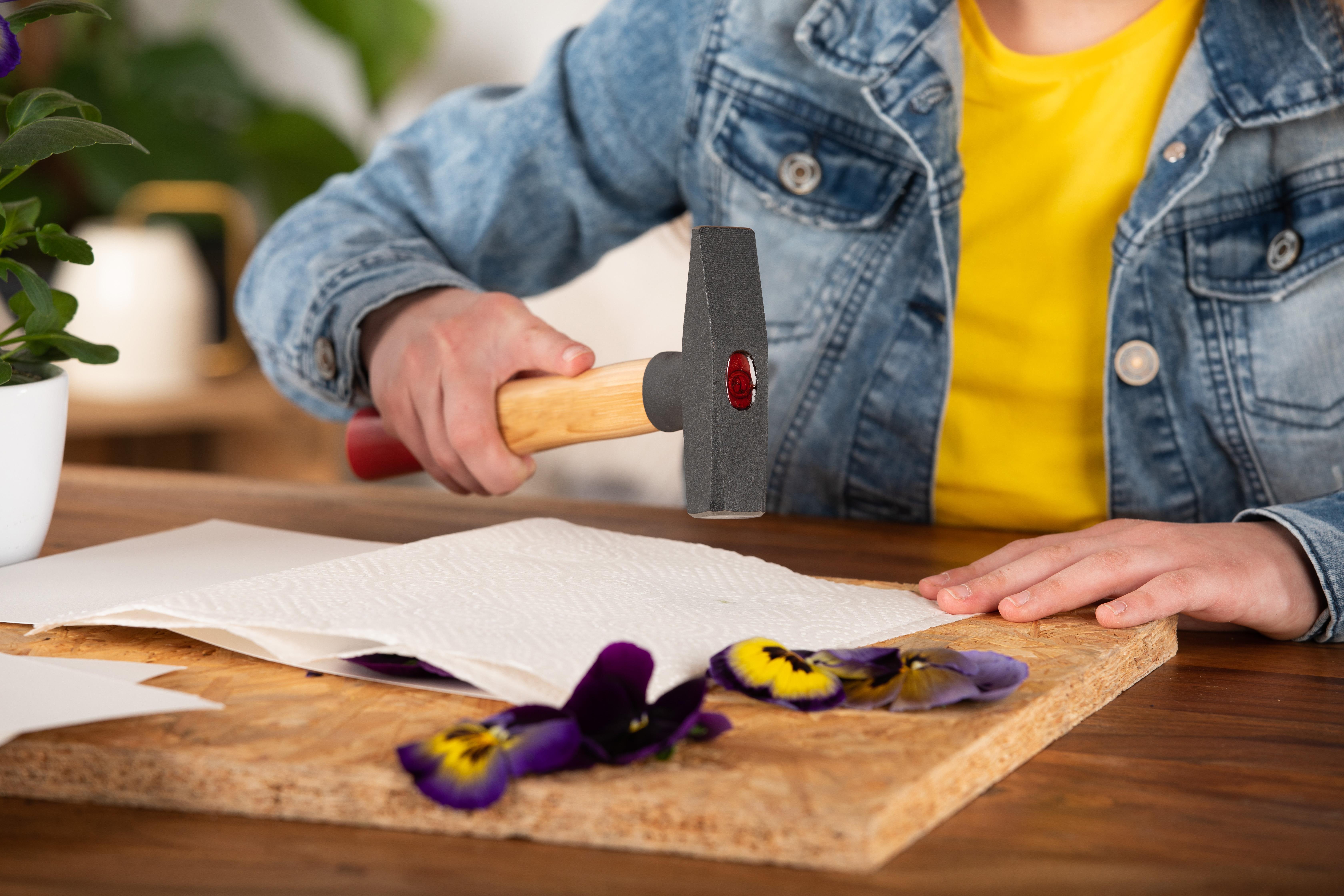 Nach dem Hämmern musst du vorsichtig das Küchenpapier wegnehmen. Die Blumen kannst du am besten mit einer Pinzette vom Papier lösen.
