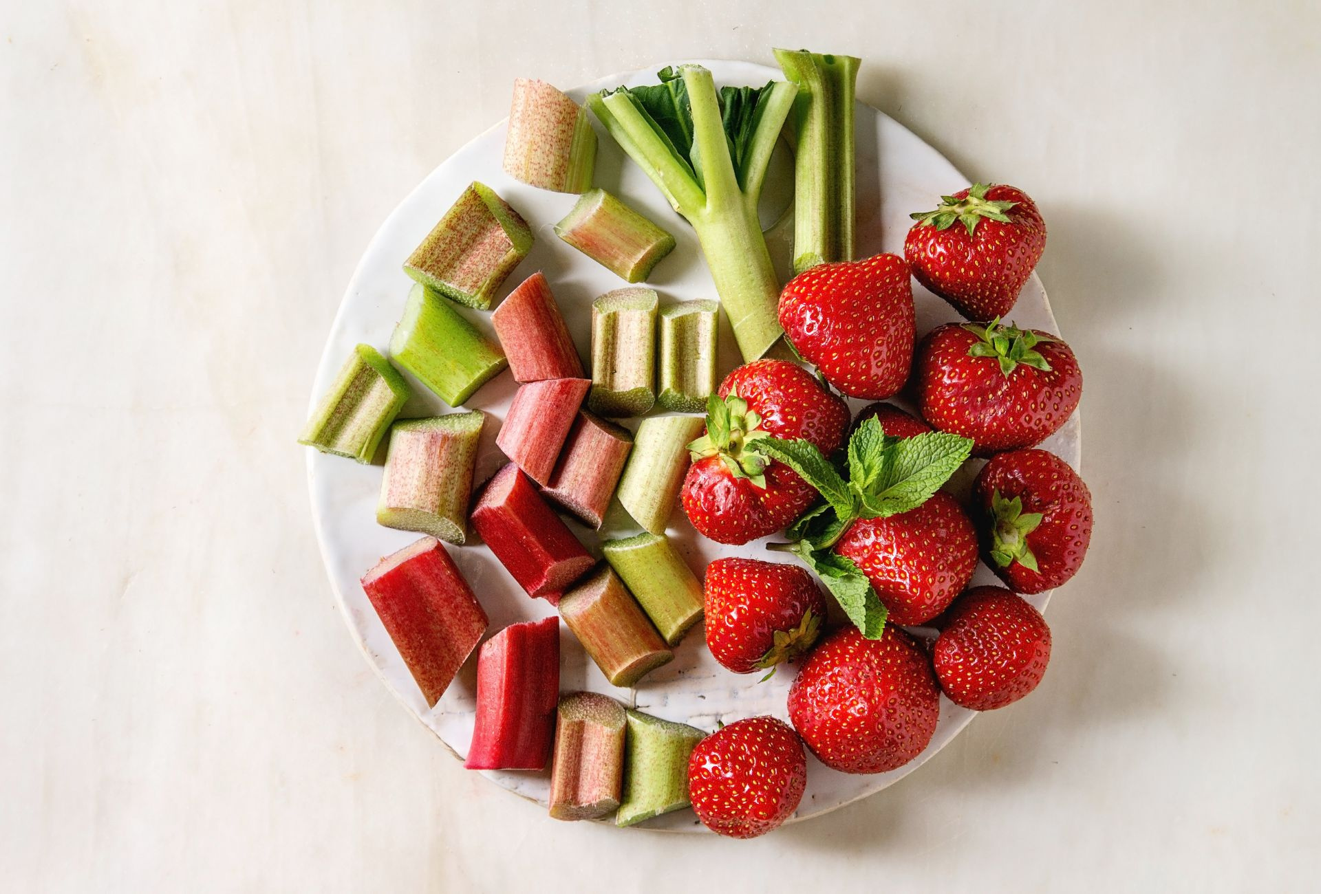 - Rhabarber schälen und in kleine Stücke schneiden. Erdbeeren putzen und würfeln. Beides mit 2 EL Zucker vermengen und kurz beiseitestellen.