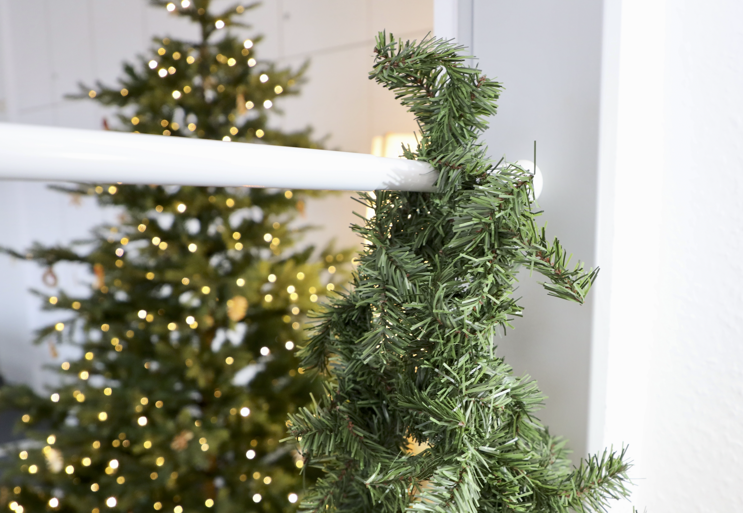 Dezente transparente Kabelbinder oder eine dünne, unauffällige Juteschnur/Angelschnur zur Befestigung der Girlande an der Stange. |